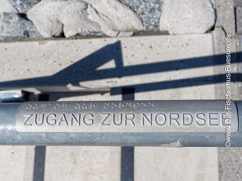 Hier finden Sie den Zugang zur Nordsee. Diese Beschriftung -auch in Brailleschrift – ist für Sehbehinderte Menschen auf jeder Treppe zur Nordsee angebracht.