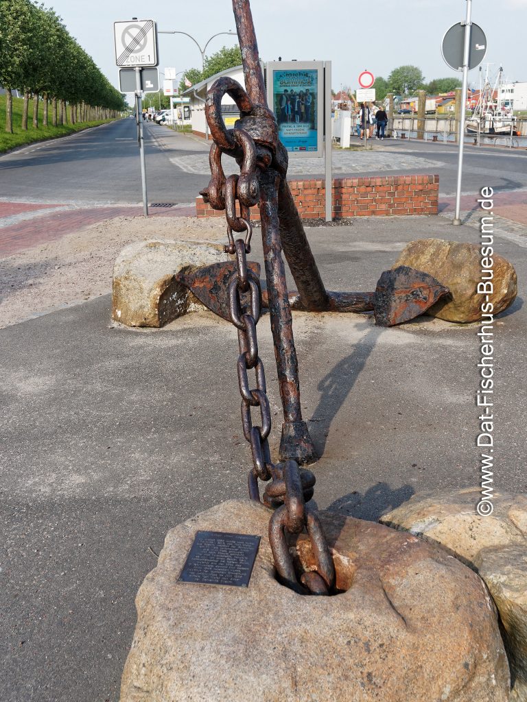 Diesen Anker hatte ein Krabbenkutter im Netz, jetzt ist er auf dem Ankerplatz aufgestellt.