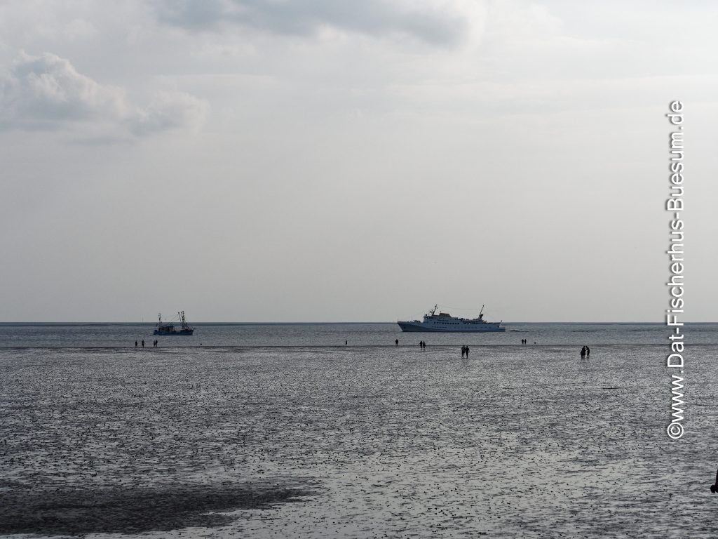 Bei Niedrigwasser läuft man im Watt fast bis zur Fahrrinne. Hier kommt gerade ein Ausflugsschiff von einer Fahrt zurück.