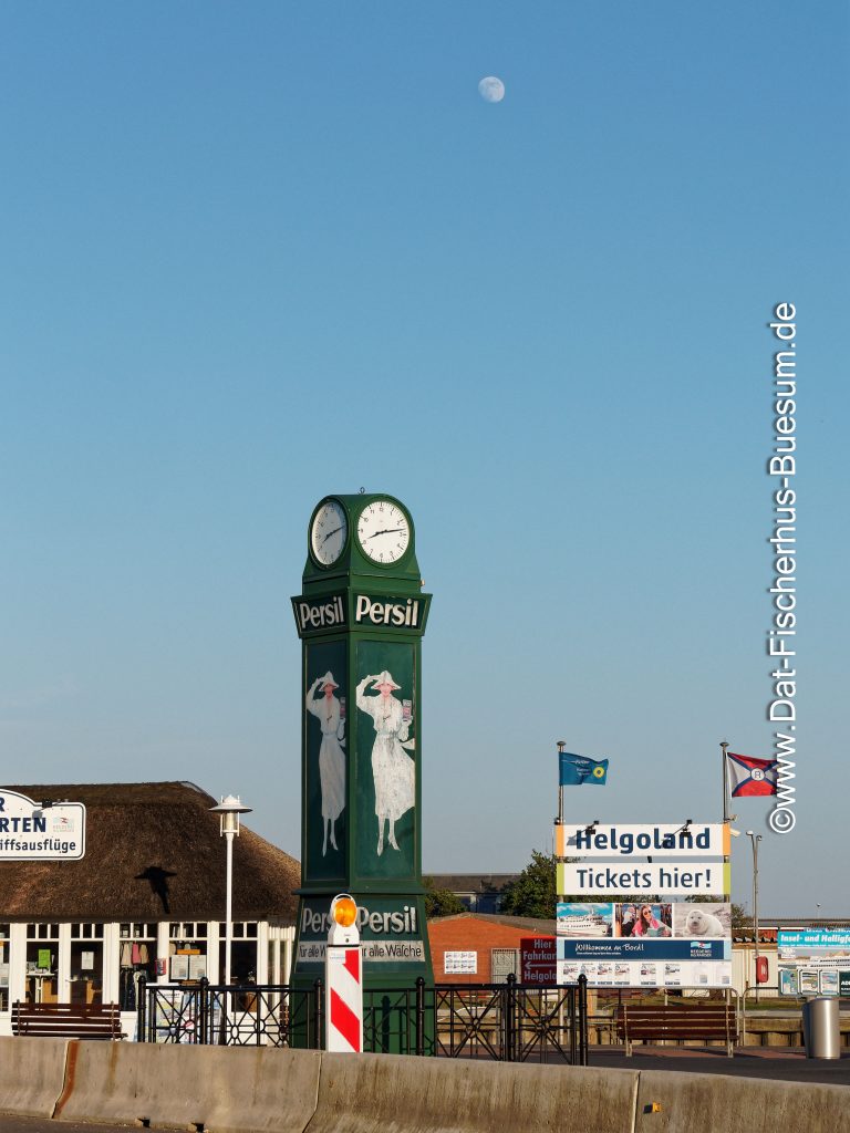 Persiluhr und Kiosk für Helgolandfahrten unter dem Mond