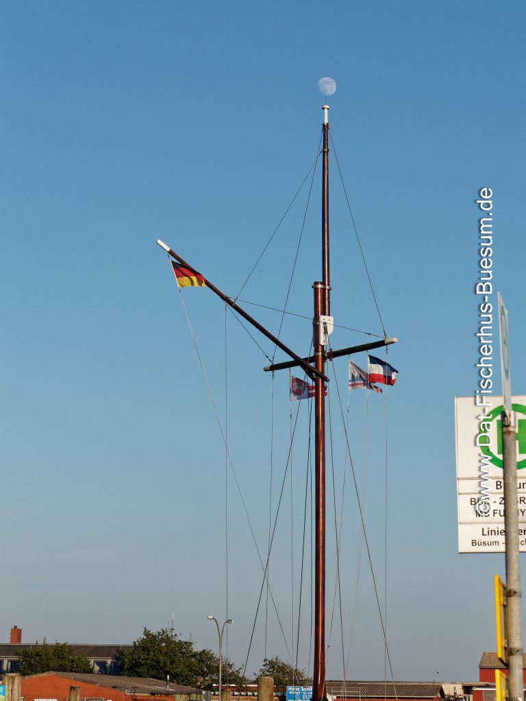 Auch über dem Flaggenmast auf dem Ankerplatz steht der Mond