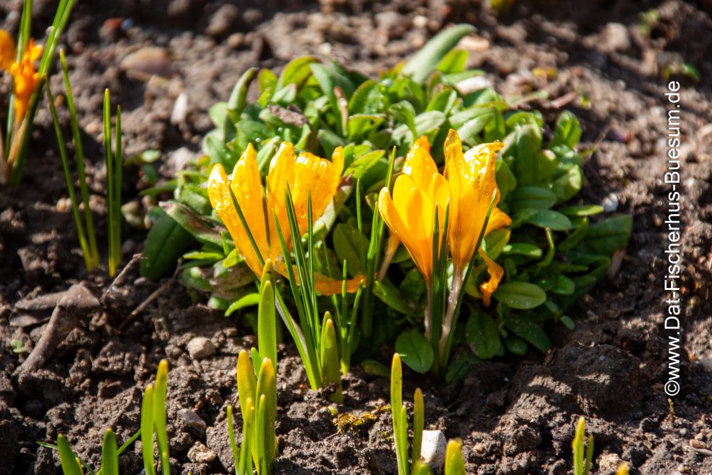 Krokusse blühen im Garten unserer Ferienwohnungen in der Fischersiedlung in Büsum.