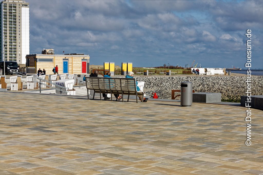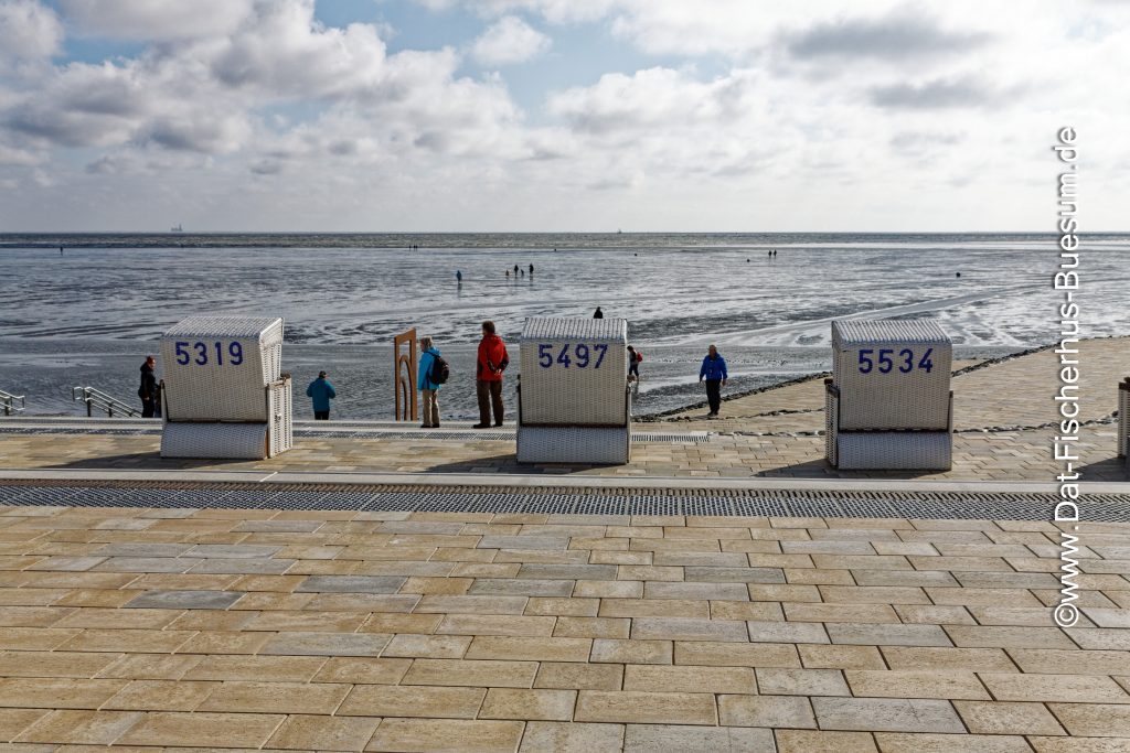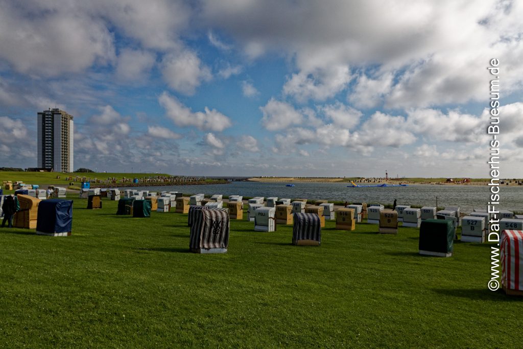 Strandkörbe auf dem Deich der Perlebucht in Büsum. So schlecht sieht das Wetter gar nicht aus.