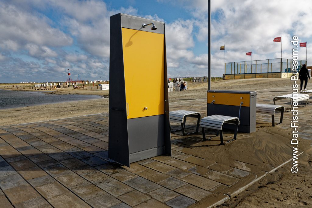 Die neuen Duschen und Sitzbänke auf dem Sandstrand.