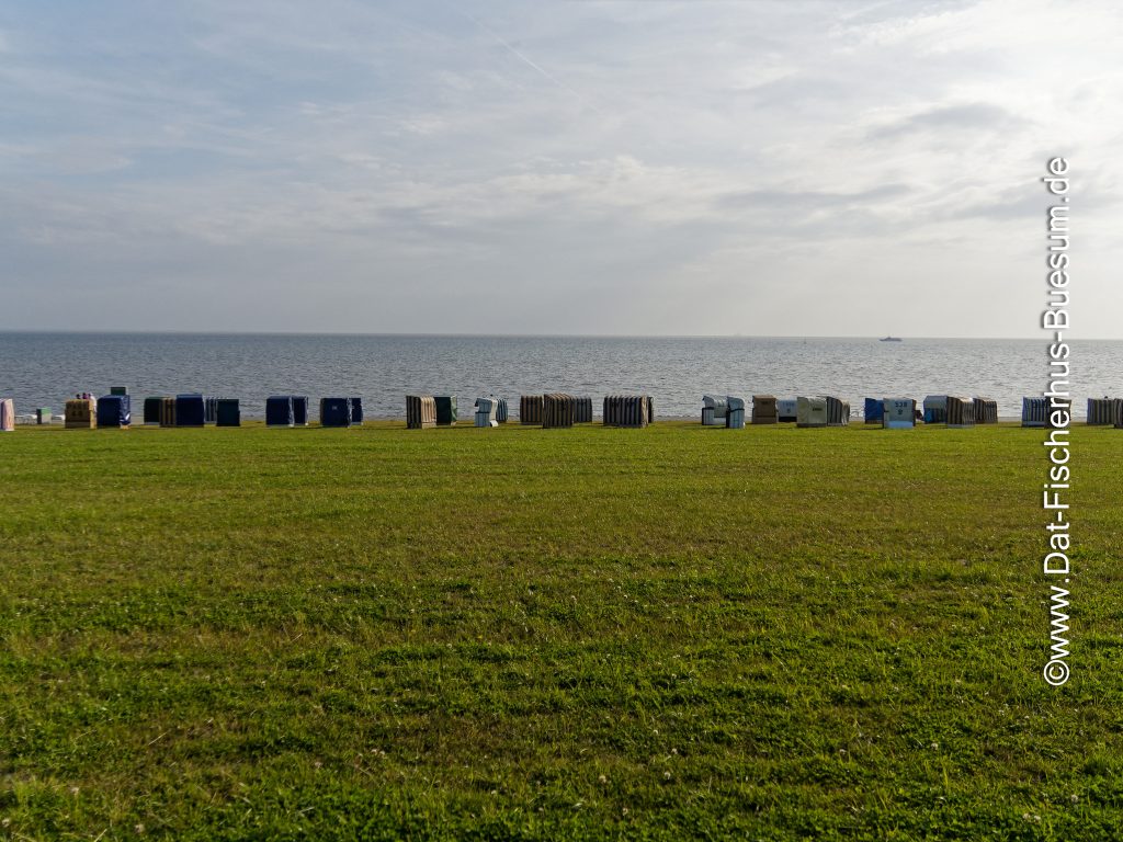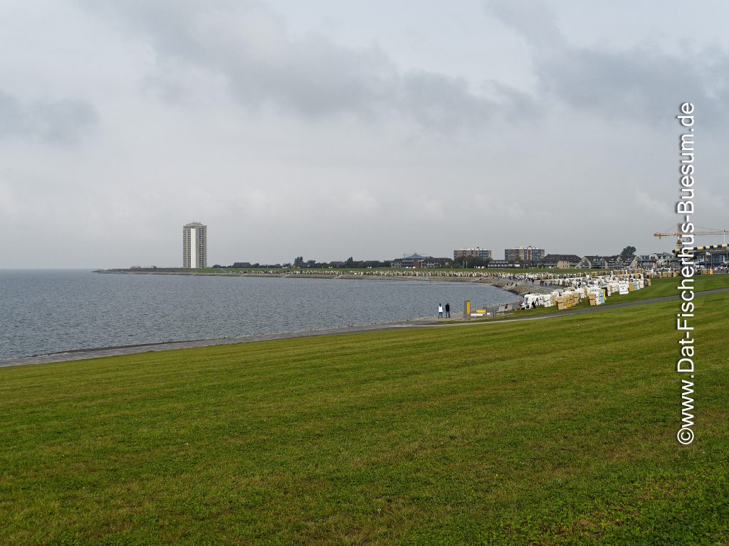 Der Büsumer Strand. Viele Gäste nutzen das schöne Wetter für einen Spaziergang auf den neuen Promenaden.