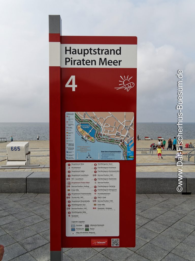 Der Hauptstrand trägt die rote Farbe. Vor der Watt-Tribüne steht dieses Hinweisschild.