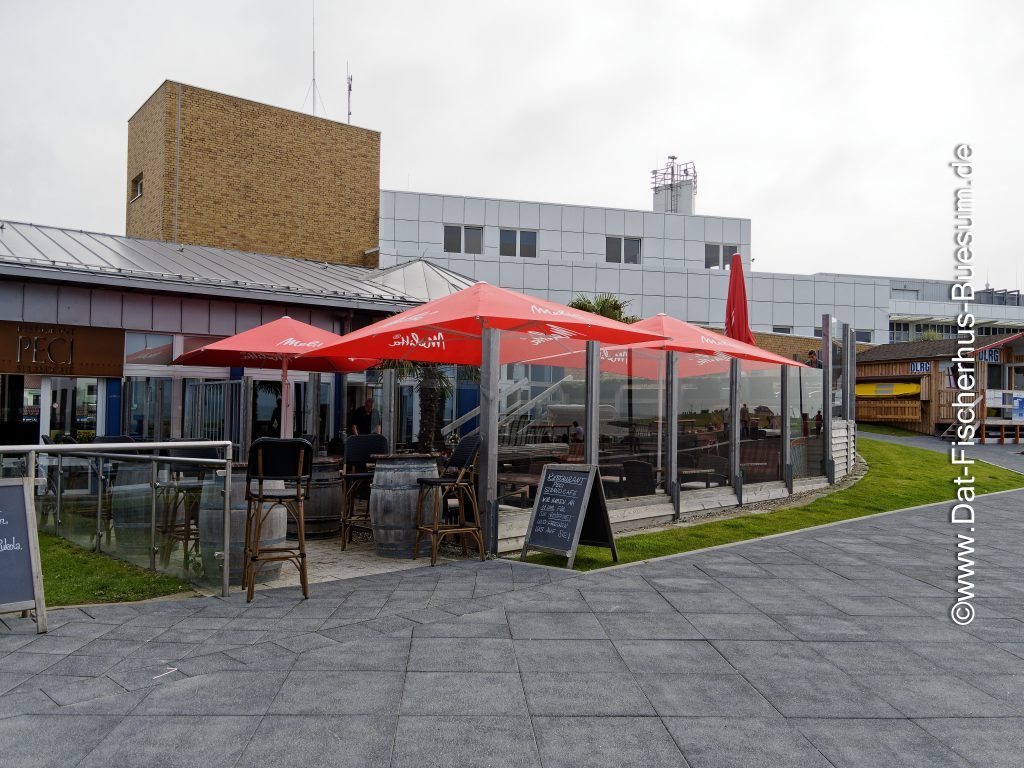 Auch das Restaurant am Hauptstrand hat rote Sonnenschirme.