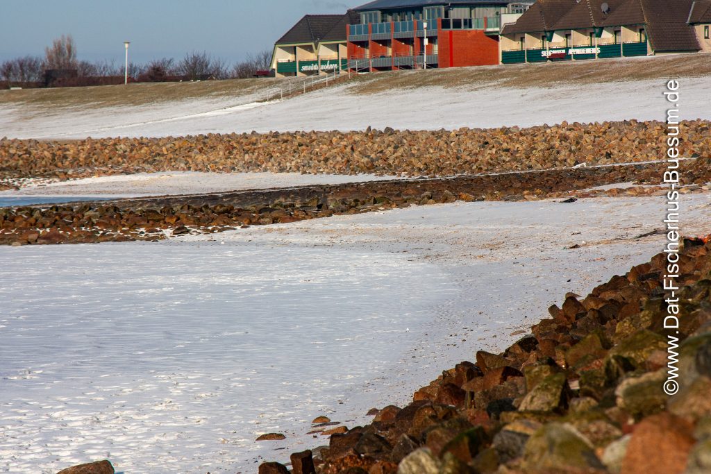 Auch auf dem Watt, in der Buddelzone für die ganz kleinen, hat sich Schnee gesammelt. Ein Spaziergang im Winter am Deich in Büsum ist immer ein ganz besonderes Erlebnis und man kann hinterher wunderbar entspannen.
