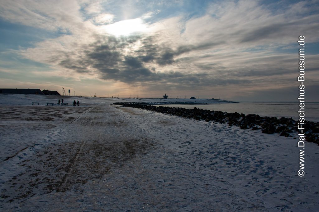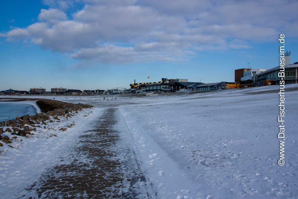 Strand und Deich sind unter einer dünnen Schneeschicht verschwunden, man sieht nur ein paar Schlittenspuren. Die Sonne strahlt vom Himmel und es sind nur wenige Menschen unterwegs.