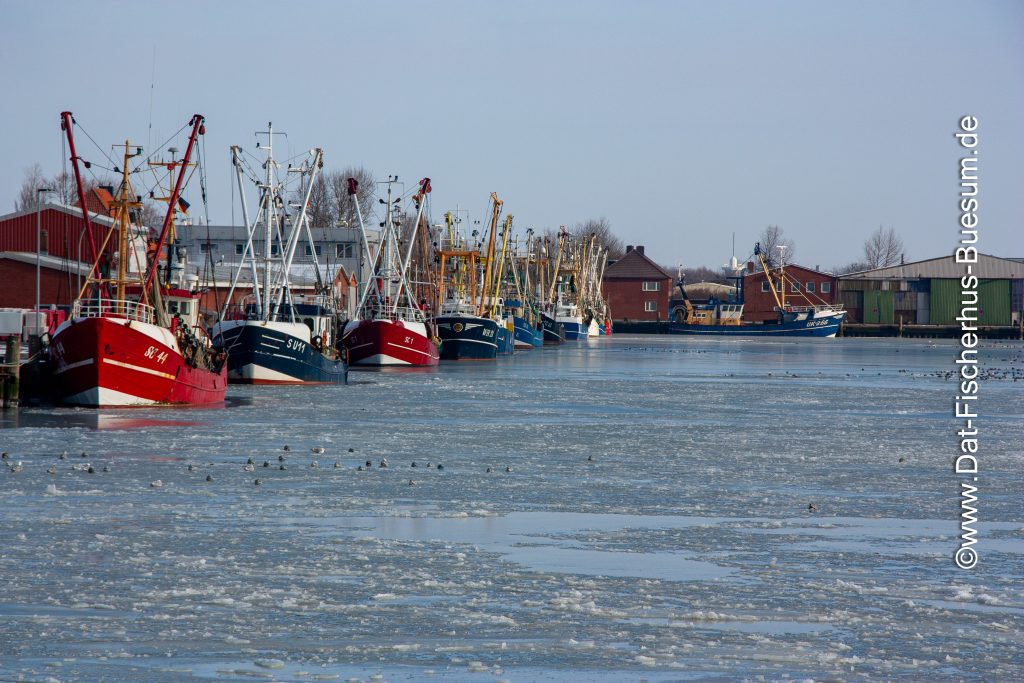 Der Hafen ist ebenfalls mit Eis bedeckt, das Foto zeigt die Krabbenkutter im Hafenbecken drei. Dort werden normalerweise die Krabben ausgeladen (angelandet), allerdings ruht im Winter die Krabbenfischerei.