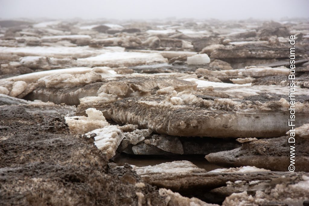 Dicke Eisschollen bedecken das Watt, durch Ebbe und Flut bildet sich normalerweise keine geschlossene Eisdecke auf der Nordsee. Deshalb die übereinandergeschobenen Eisschollen.