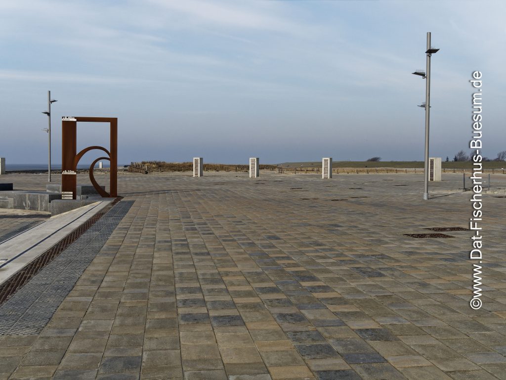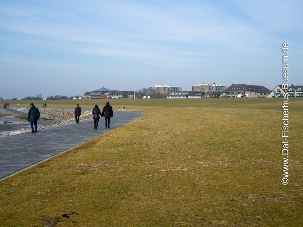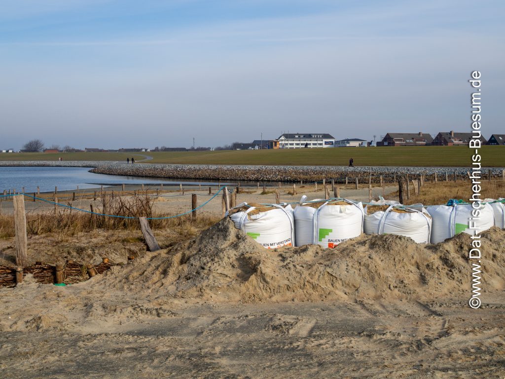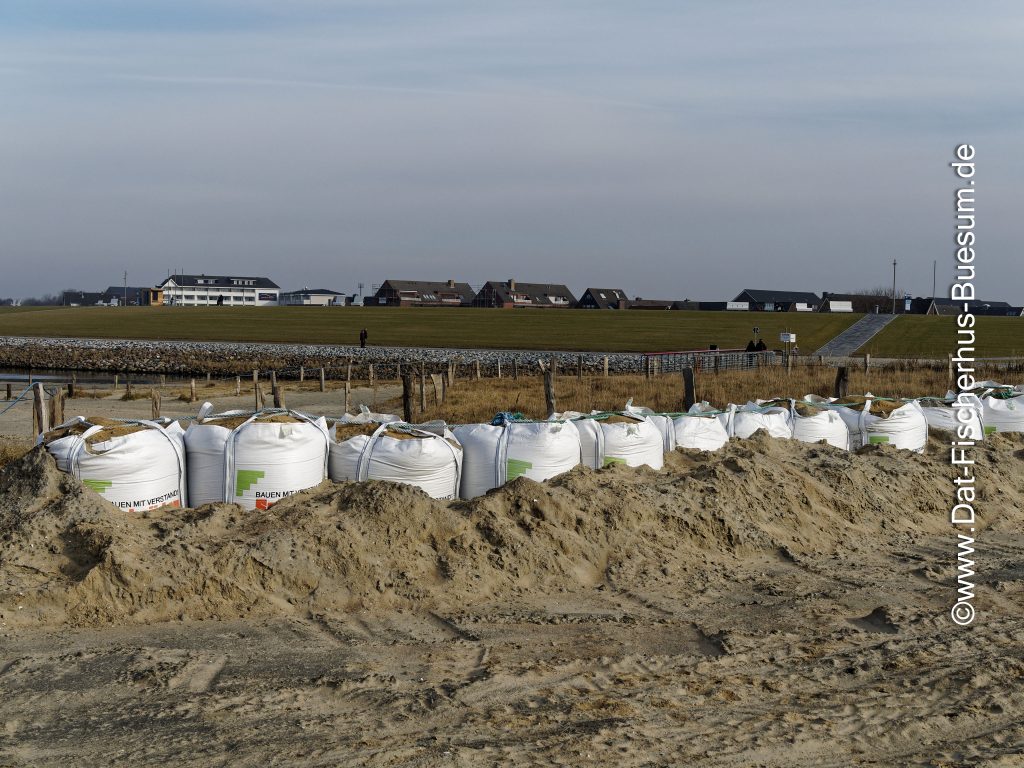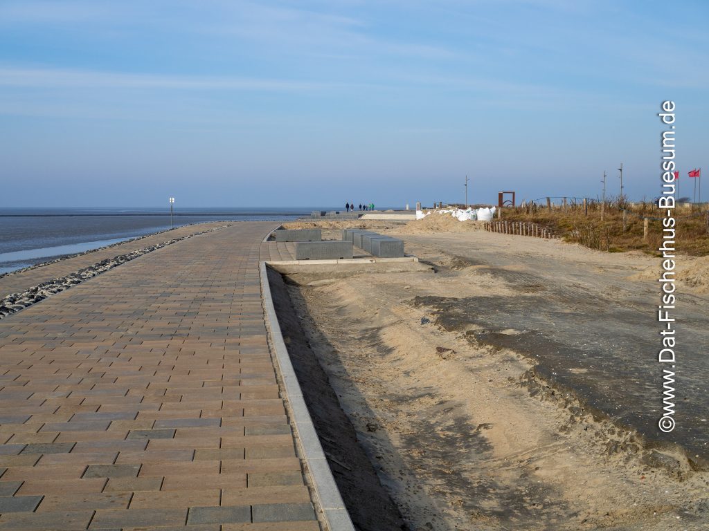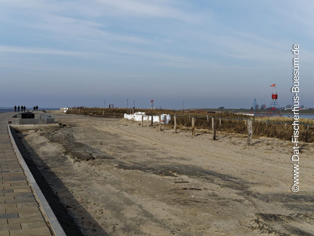 Der Deich sieht unbeschadet aus, er hat die bisherigen Sturmfluten gut überstanden. Nur am Anschluss an die Strandpromenade ist etwas ausgespült. Das sollte in den nächsten Jahren besser werden, wenn die Grasnarbe dichter geworden ist.