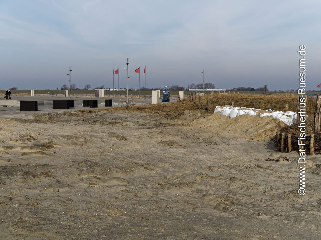 Den Sandstrand hat es etwas stärker getroffen. Die Wege sind notdürftig mit Sandsäcken abgesperrt, damit das Wasser den Sand nicht mitreisst.