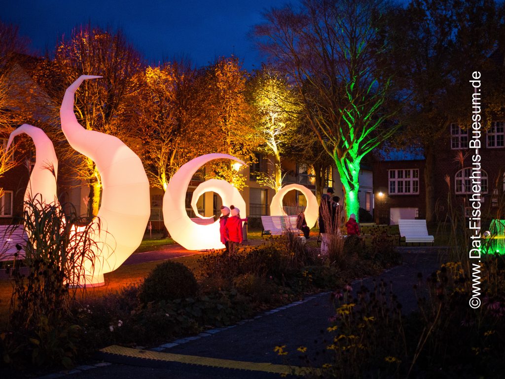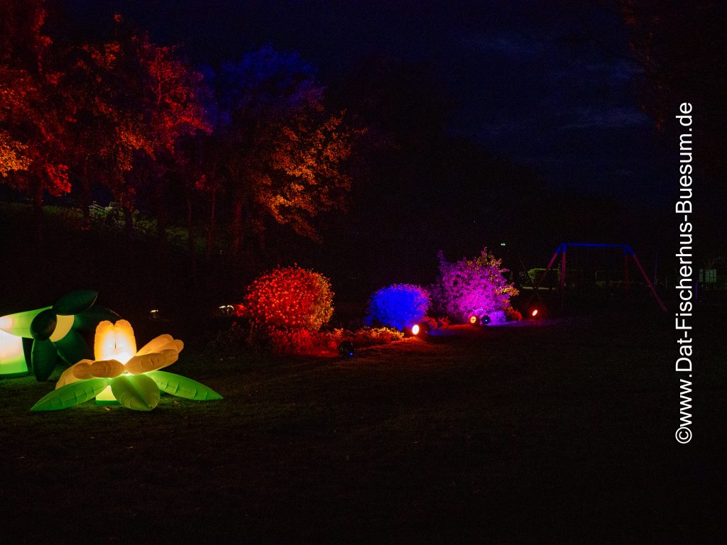 Trotz des kalten Windes aus südwestlicher Richtung, der uns von Deich drängen will, spazieren wir Richtung Hochhaus. In dieser dritten Büsumer Lichterwoche ist ein neuer Standort hinzu gekommen: der Wohlfühlgarten im Kurpark vor dem Hochhaus.