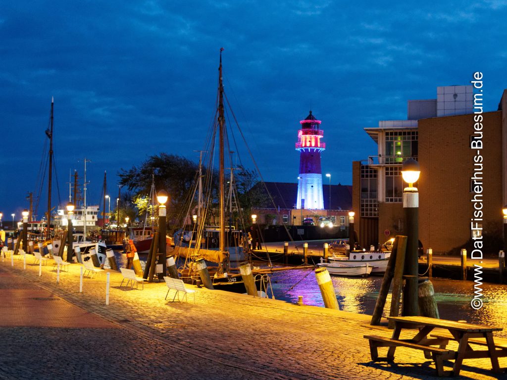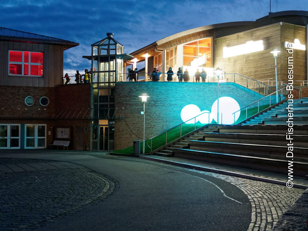 Auf dem Weg durch den Ort zurück fallen mir noch einige Gebäude auf, die in die Büsumer Lichterwoche einbezogen werden können. Wir kommen am Feuerwehrgerätehaus und der Gemeinschaftspraxis vorbei und auch das Hochhaus würde in „neuen Farben“ bestimmt prächtig aussehen. Bei privaten Gebäuden, wie dem Hochhaus, bin ich mir der Problematik durchaus bewusst und auch, dass sich das meiste Leben in der Fußgängerzone abspielt ist mir klar. Aber mit einem Wegweiser oder einer Art Schnitzeljagd könnte das Spektakel ausgeweitet werden.