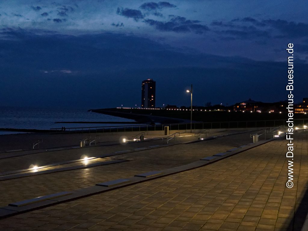 Am Strand ist die Beleuchtung auf dem Deich eingeschaltet und es sind doch einige Spaziergänger zu sehen.