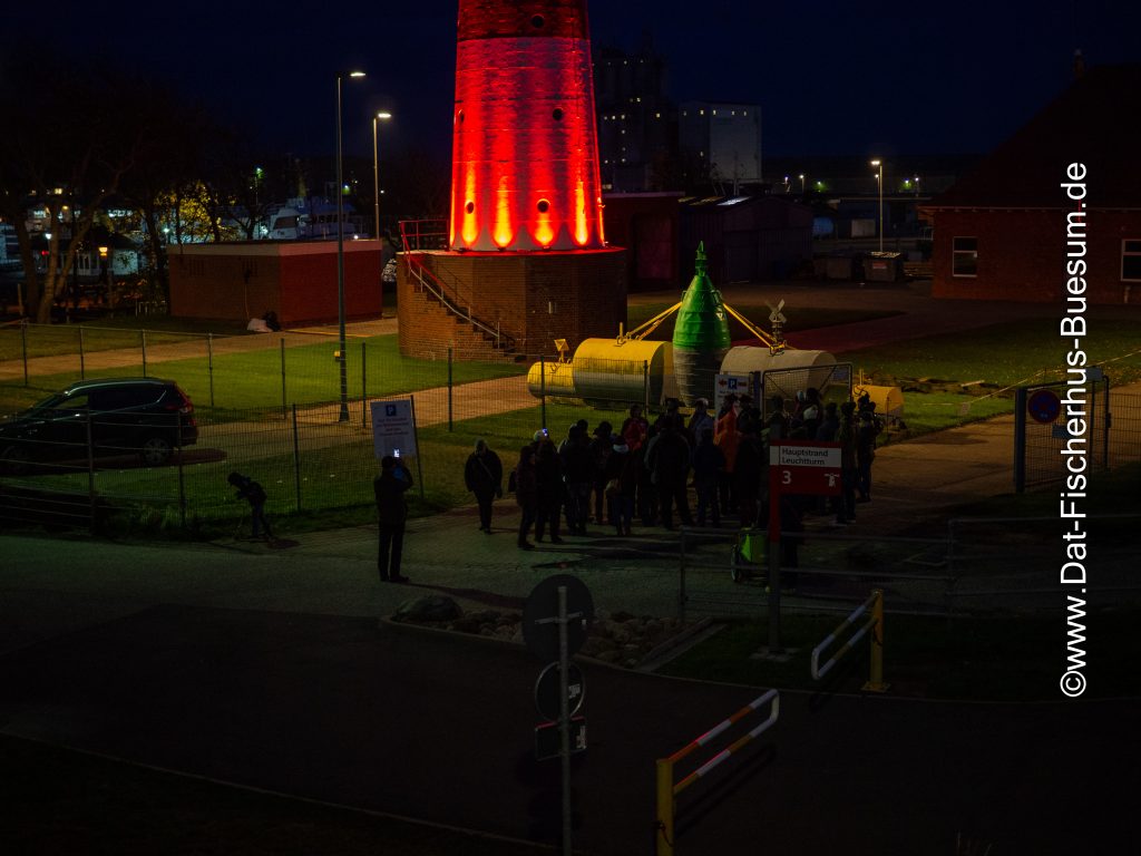 Am Strand weht eine kräftige kalte Brise. Der farbige Leuchtturm ist auch bei den vergangenen Lichterwochen ein Anziehungspunkt gewesen. Vom Deich aus läßt er sich besonders gut fotografieren. In diesem Jahr scheint es auch Führungen zu geben, die Menschenmenge unterhalb des Leuchtturmes läßt darauf schliessen.
