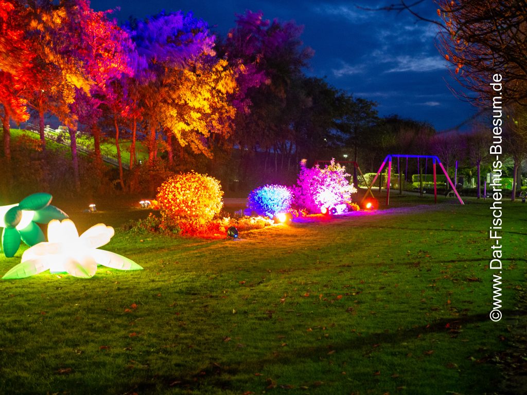 An den bekannten Plätzen werden die Skulpturen und das Umfeld in verschiedenen Farben angeleuchtet. Vor allem die Kinder sind fasziniert von dem ständig wechselnden Farbenspiel.
