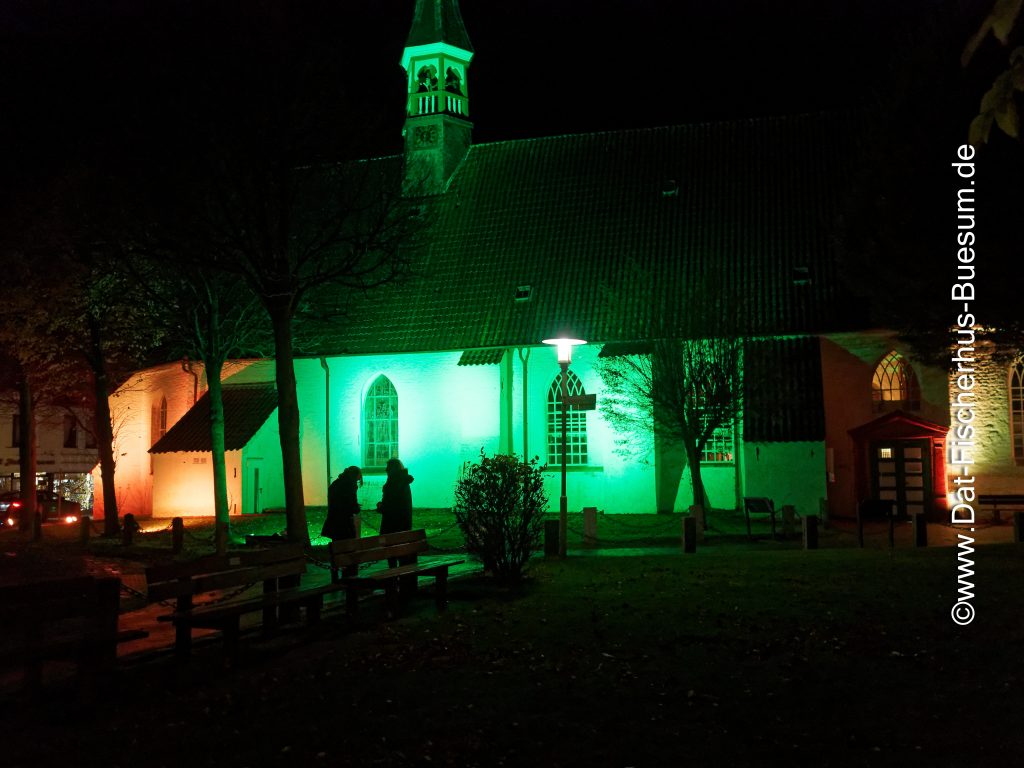 Zum Abschluß führt unser Weg zur Büsumer Fischerkirche, die ebenfalls in wechselnden Farben erleuchtet ist.