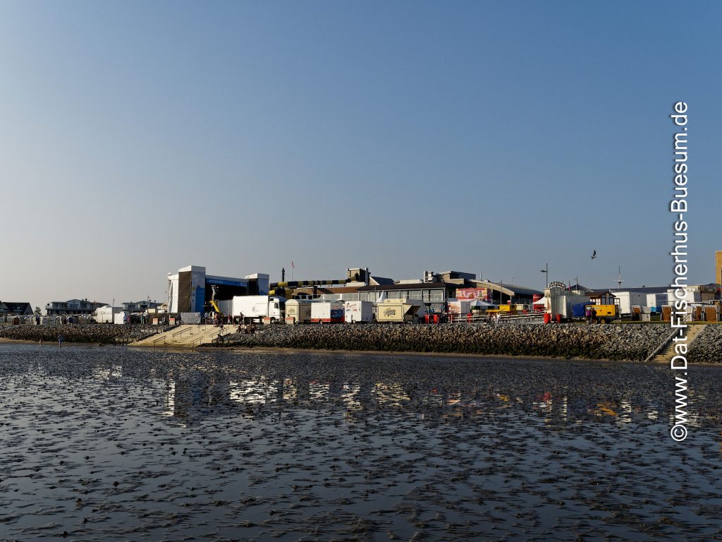 Vom Watt sind die LKWs zu sehen, die das Material für die Bühne und vorgekühlte Getränke anliefern.