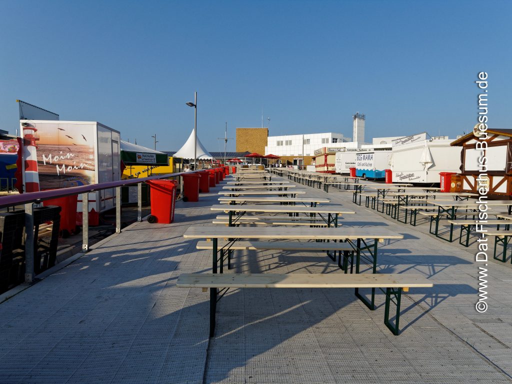 Noch sind die Bänke und Tische leer und warten auf das große Ereignis. Hier ist der „Anbau“ der Watt-Tribüne zu erkennen.