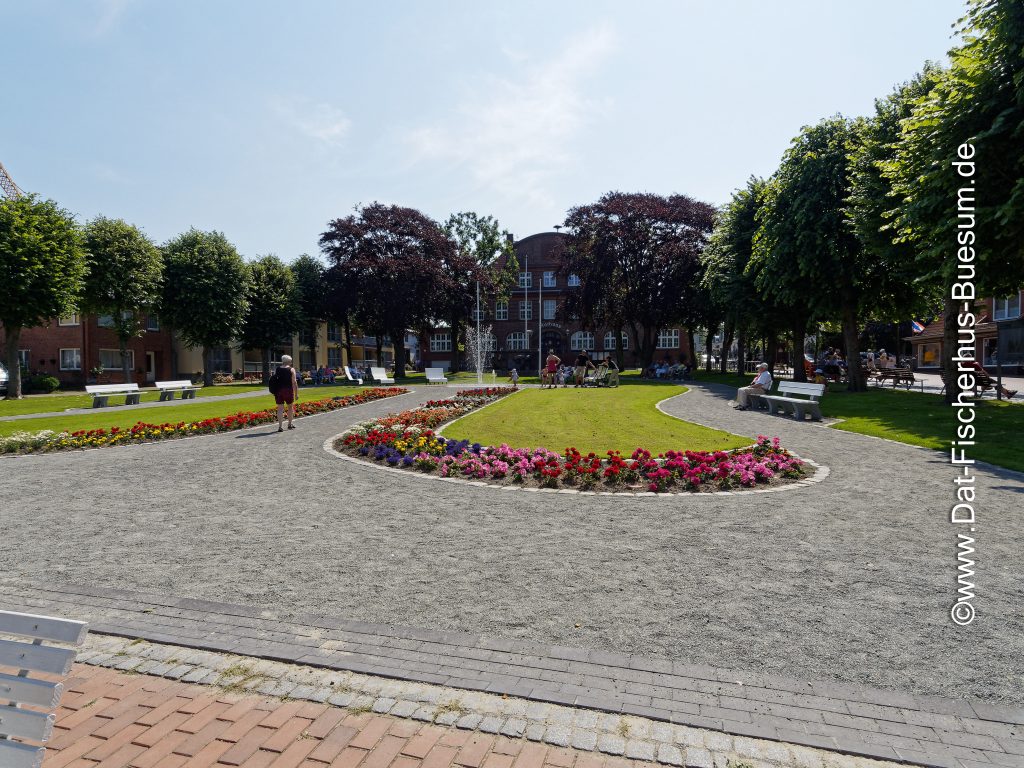 Der neu gestaltete Rathauspark in Büsum. Ohne Zaun und barrierefrei ist die Integration in die Fußgängerzone sehr gelungen.