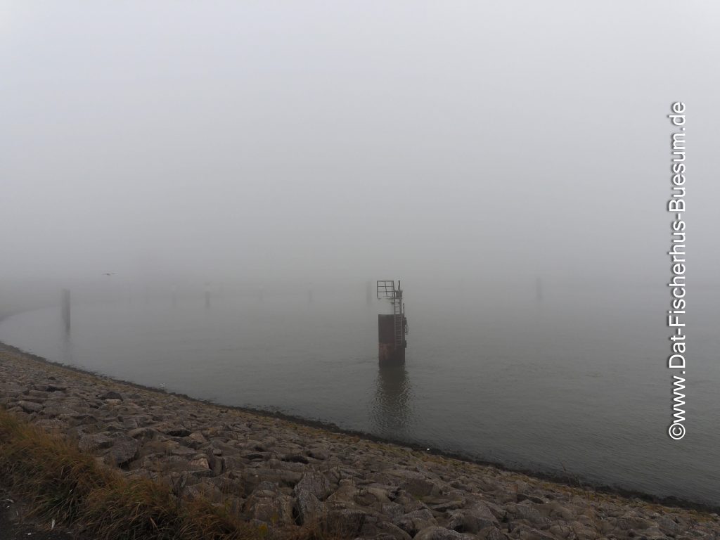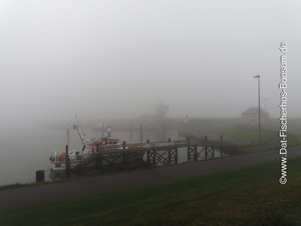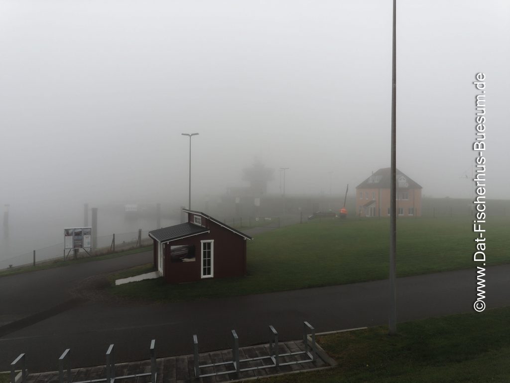 An der Schleuse, in Höhe des Seenotrettungskreuzers, wird die Nebelsuppe noch etwas stärker. Die Zufahrt zum Hafen ist kaum zu sehen. Auf der Mole sehen wir dann auch nicht einmal zur anderen Seite.