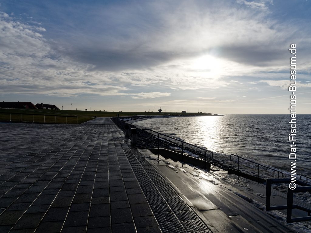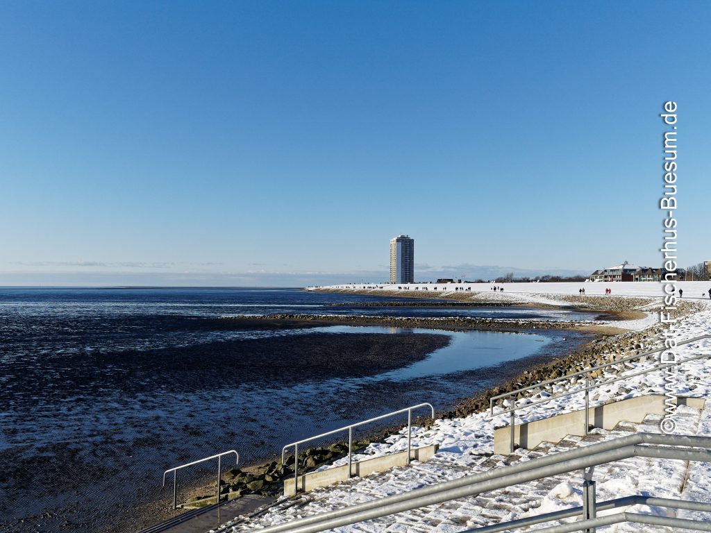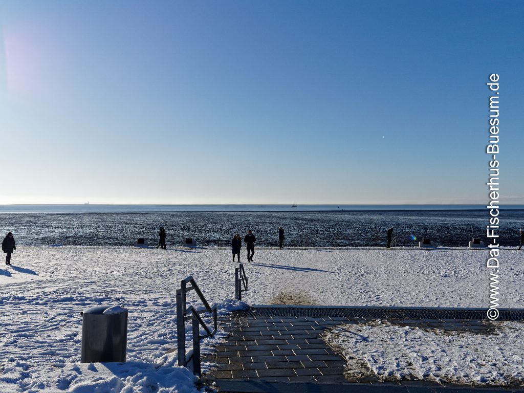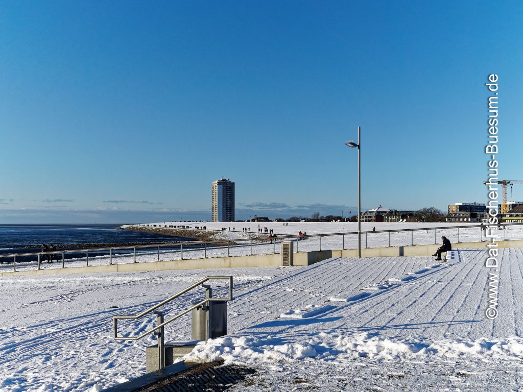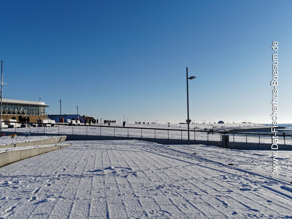 Es hat geschneit und Deich, Watt-Tribüne und Strandpromenade sind malerisch weiss. Die Sonne lacht vom strahlend blauem Himmel und viele Gäste unternehmen einen Spaziergang auf der Strandpromenade oder auf dem Deich.