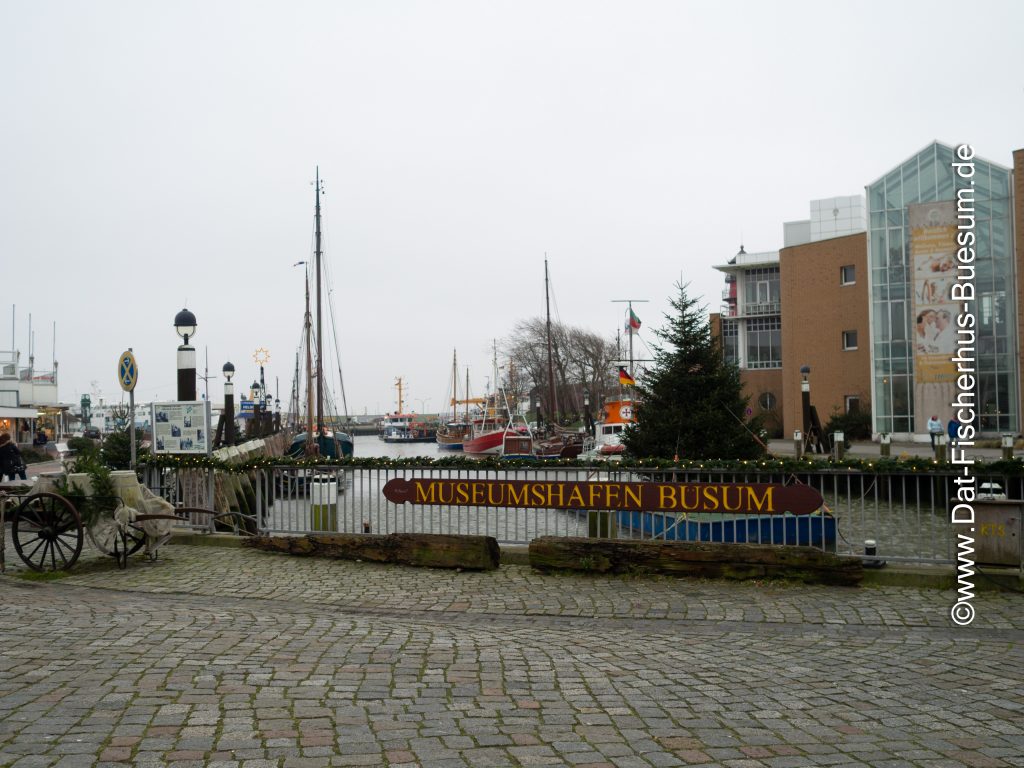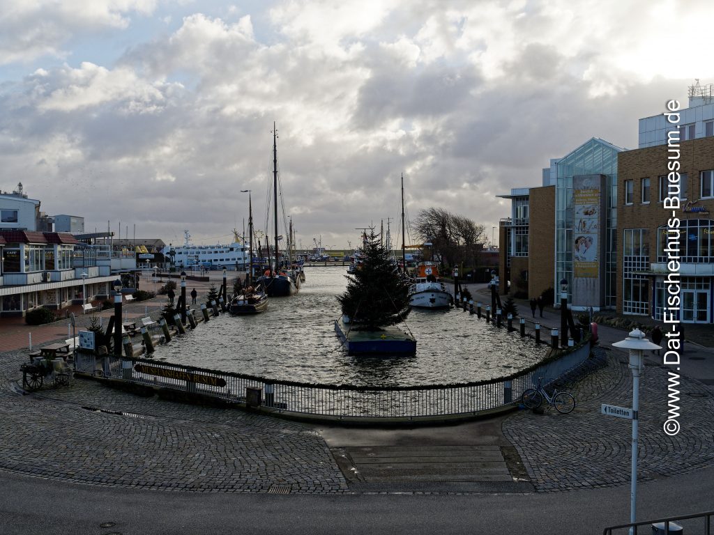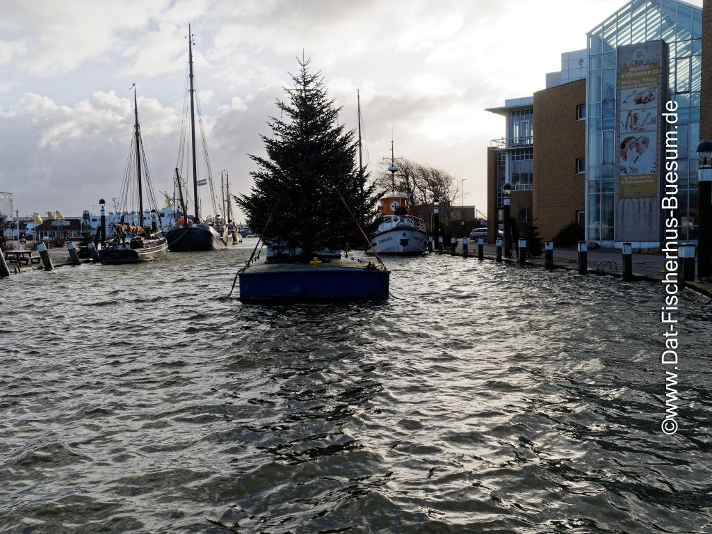 Der Weihnachtsbaum auf dem Ponton im Museumshafen wird ordentlich durchgeschüttelt.