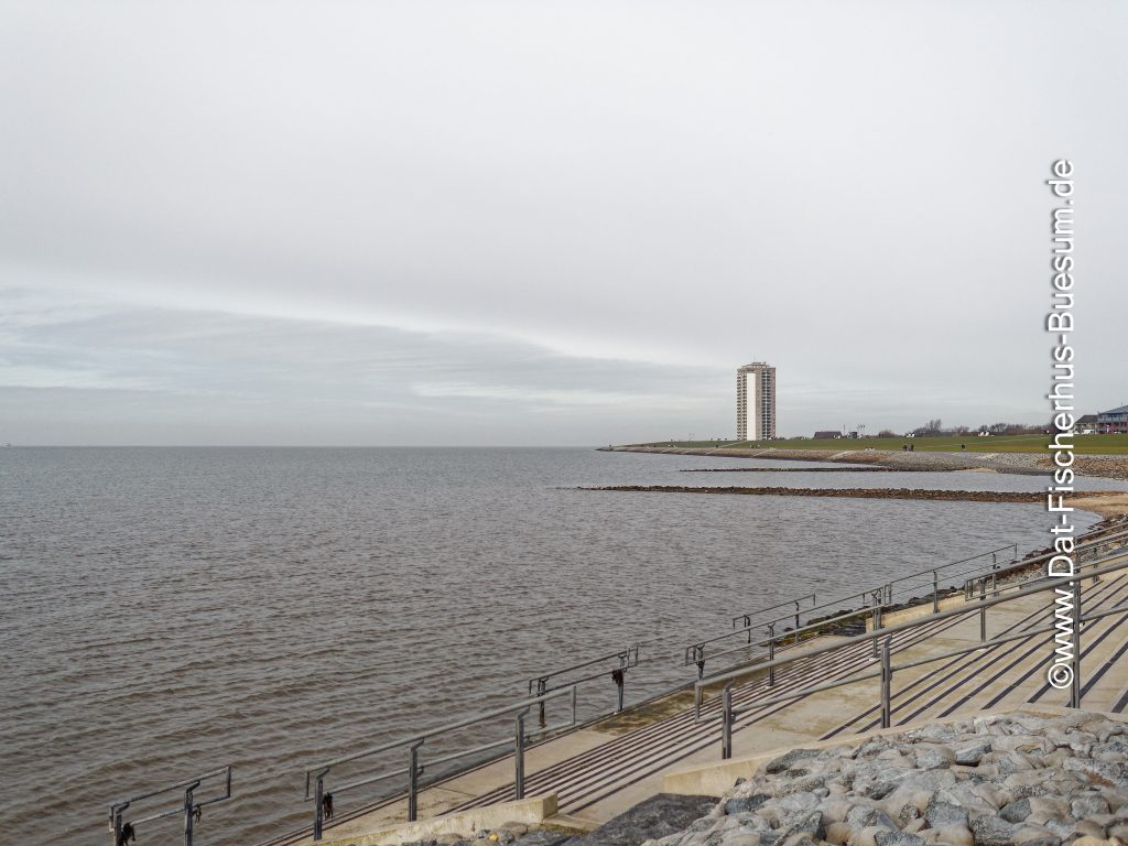 Der Deich ist noch nass von den vergangenen Strumfluten.